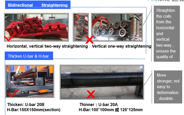 11. BI yönlü doğrultma kolu yüksek mukavemetli alaşımlı malzemeden, yüksek mukavemetli, aşınma önleyici ve aşınan parçaların ömrünü artıracak şekilde yapılır, inşaat demiri kafesinin kalitesini sağlamak için bobinlerin yatay / dikey çift yönlü ayarı olabilir.